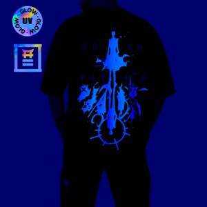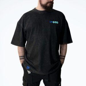 Camiseta negra oversize con efecto acid wash y estampado azul eléctrico fluor que reacciona con la luz UV, equipo nivel dios, sólo para tí.