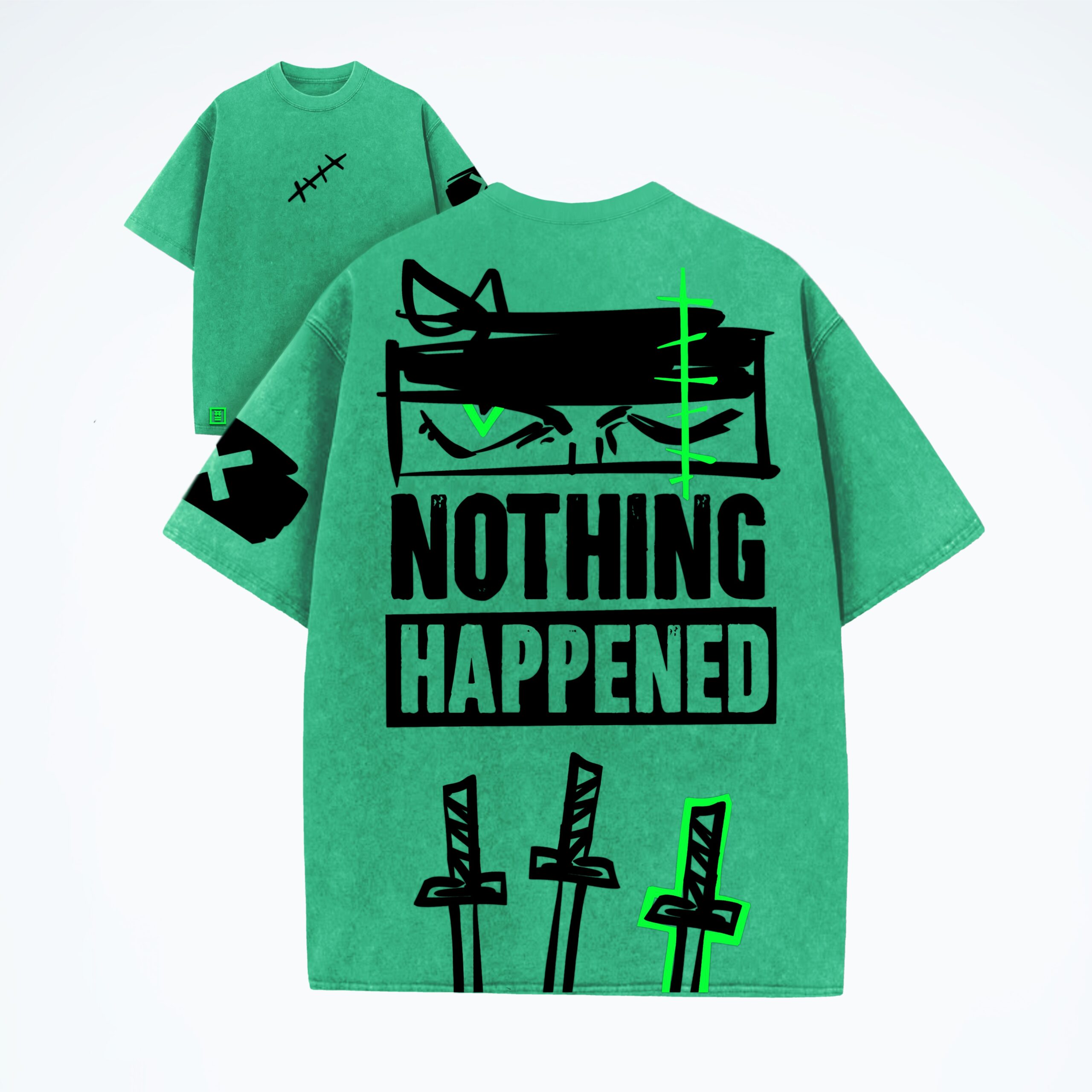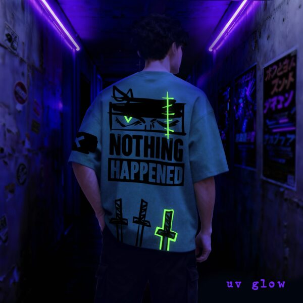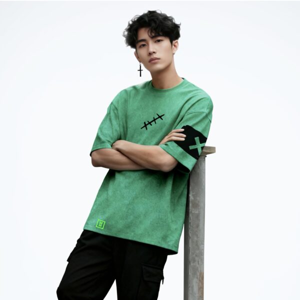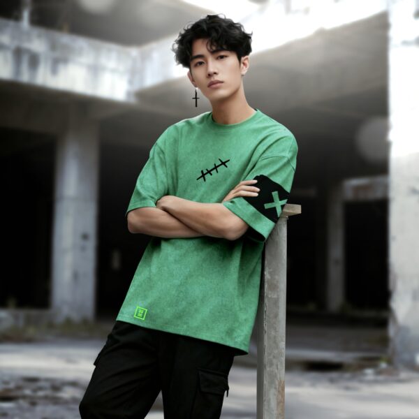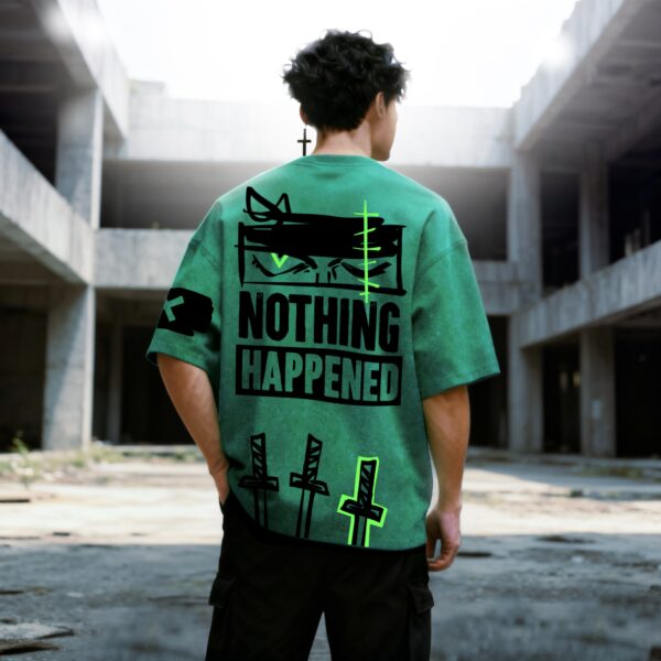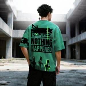 Camiseta verde oversize con efecto acid wash y estampado que reacciona con la luz UV, calidad OP para que tú decidas lo que ha pasado.