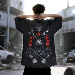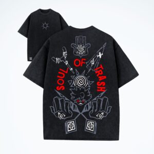 Camiseta negra oversize con efecto acid wash y un alma retorcida.
