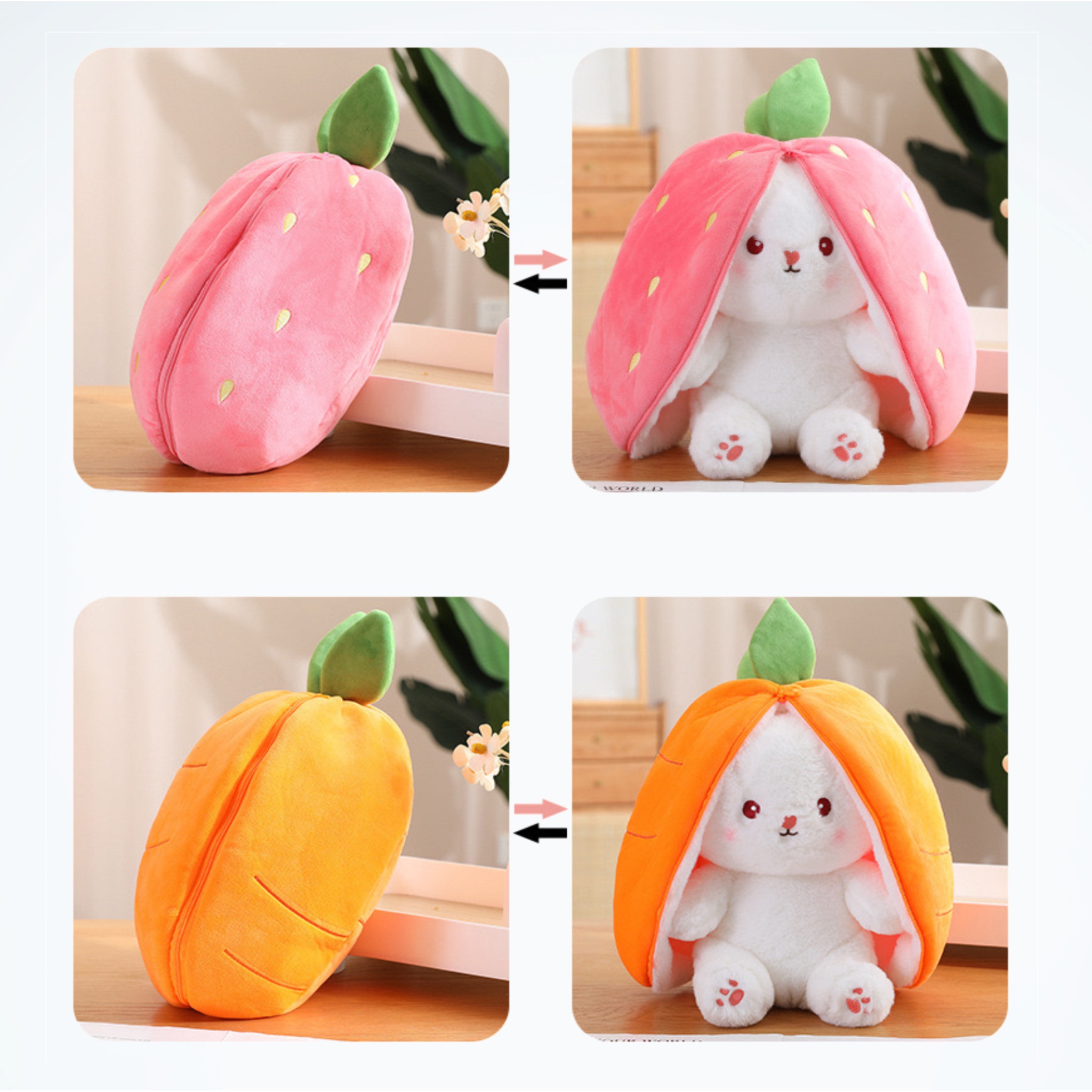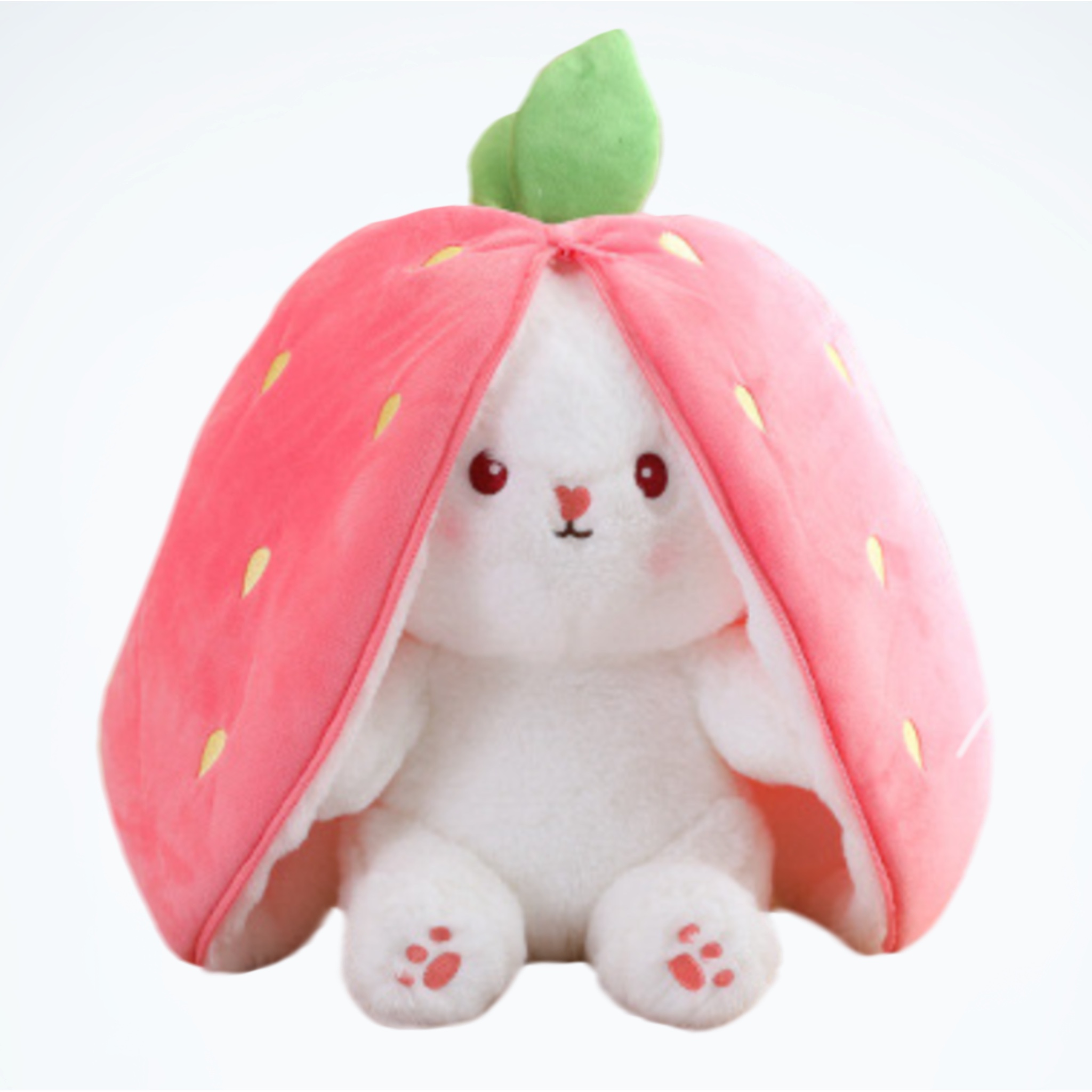 Peluche de conejito con orejas reversibles que se cierran para contenerlo en una fruta o un vegetal, un conejito schrödinger kawaii.