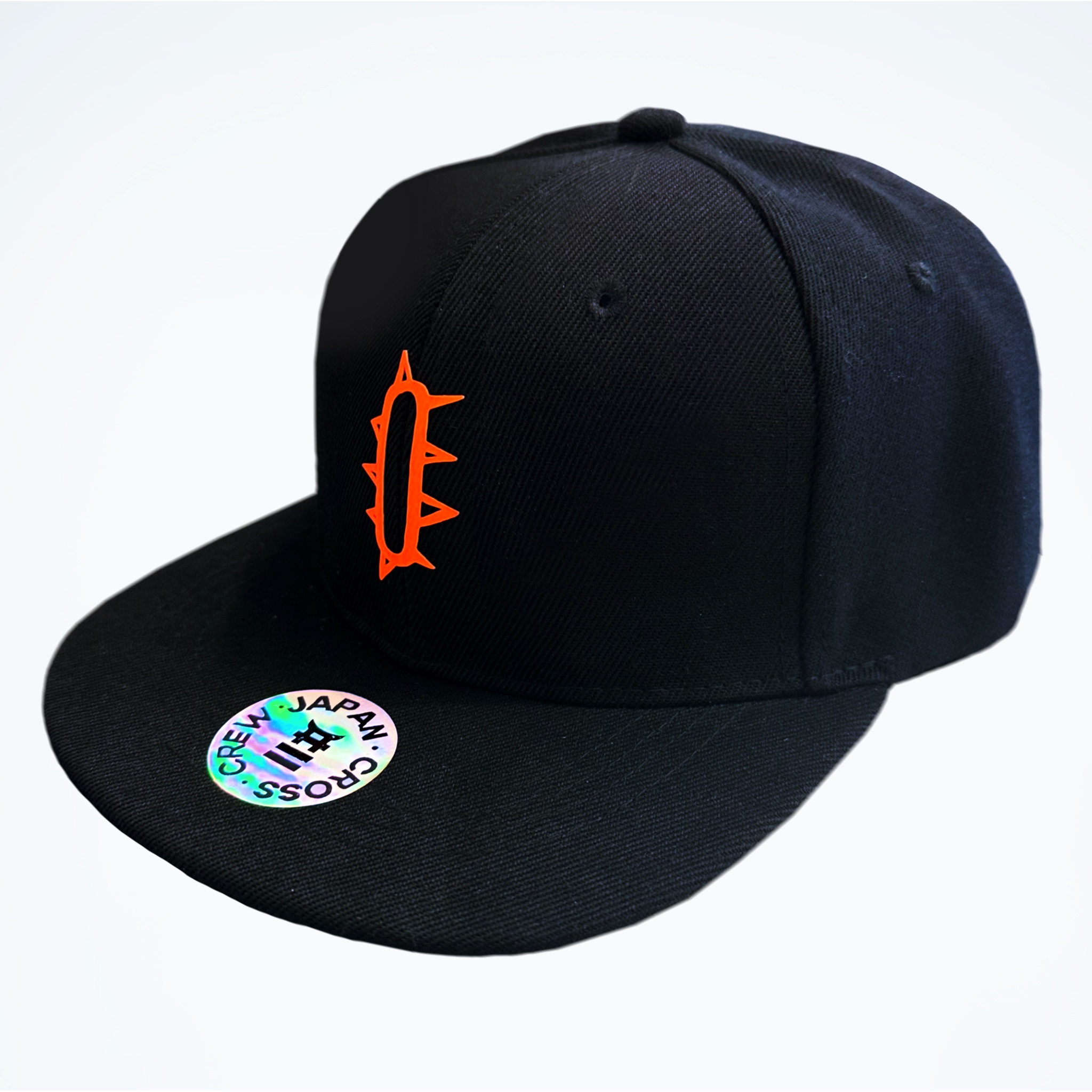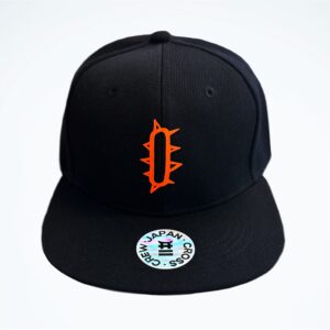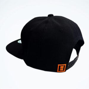 Gorra negra de visera plana ajustable con sierra en la frente, el estampado reacciona con la luz UV.