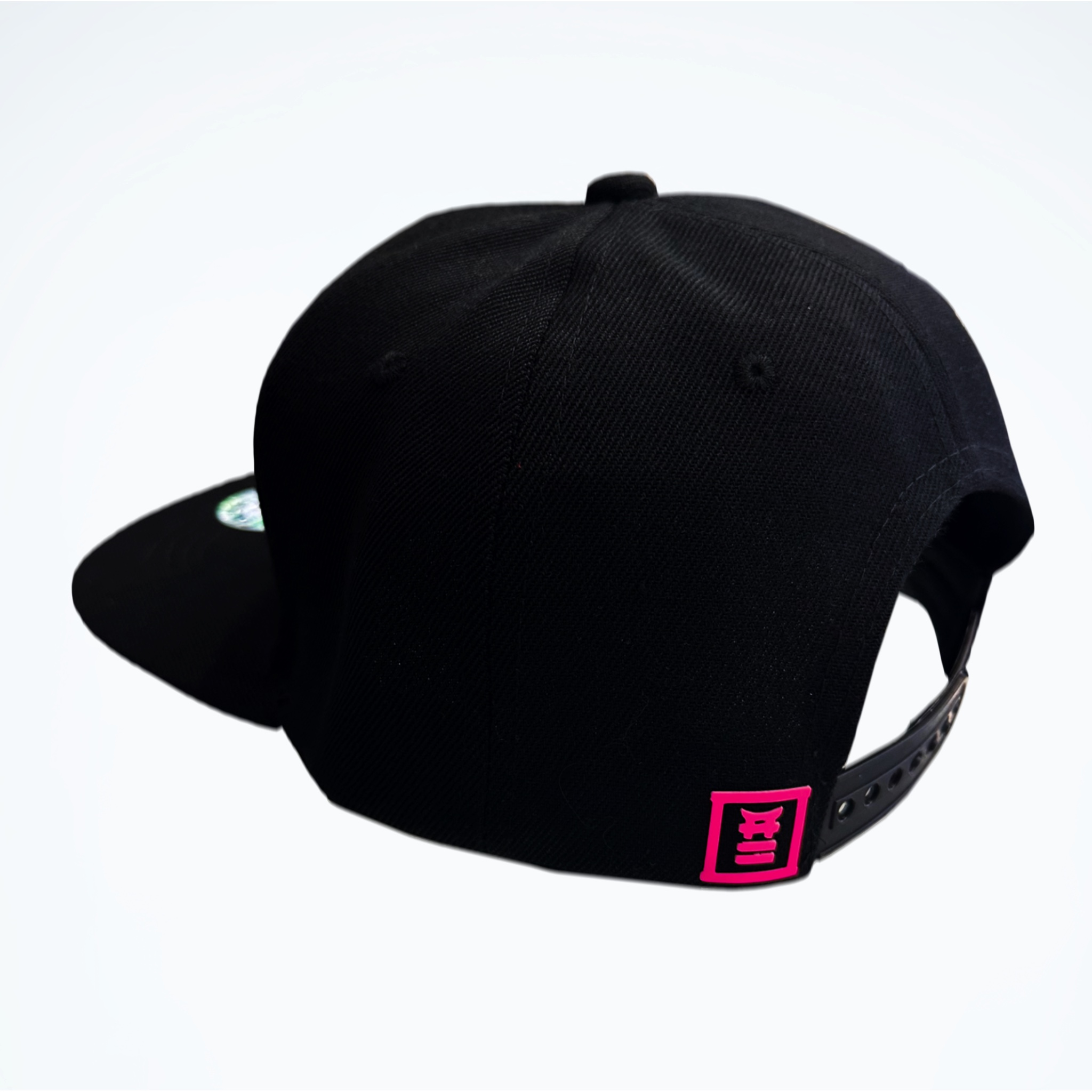 Gorra negra de visera plana ajustable con estampado que reacciona con la luz UV, para maldecir con estilo.