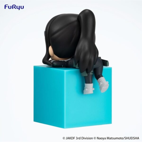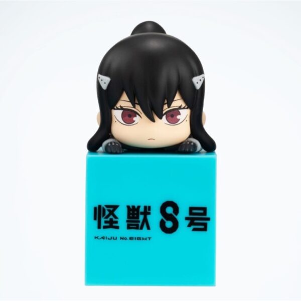 Figura hikkake de Mina Ashiro de la serie Kaiju 8, apoyada sobre un cubo escrito con el nombre de la serie.
