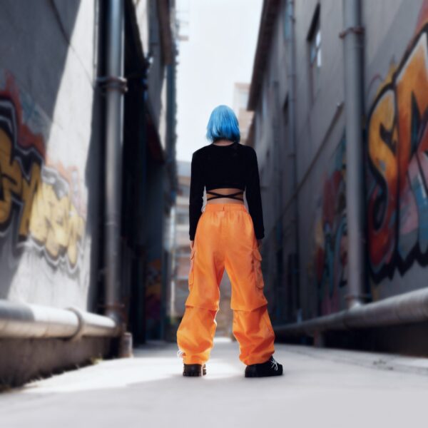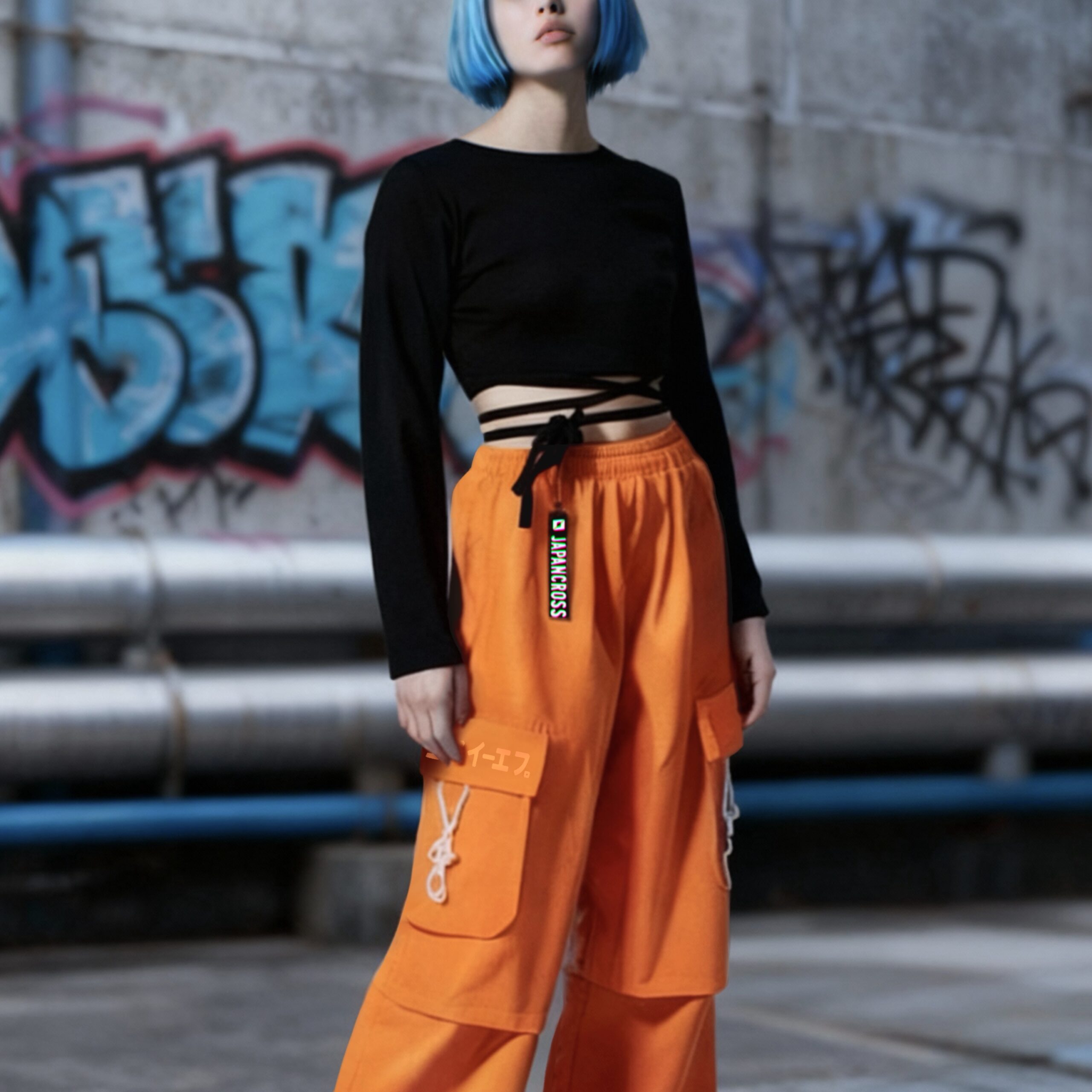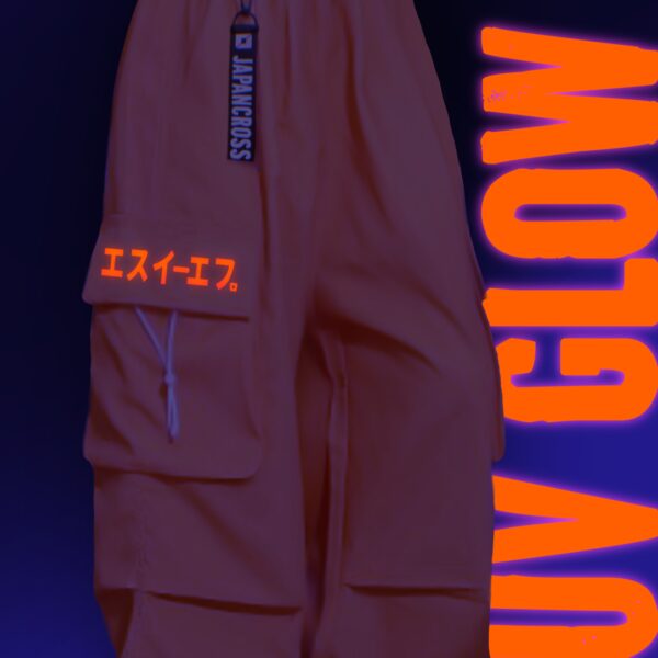Pantalón jogger de cintura elástica con bolsillos, incluye llavero colgante de la crew y el estampado reacciona brillando con la luz UV al más puro estilo cyberpunk.