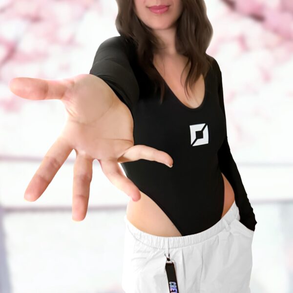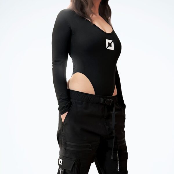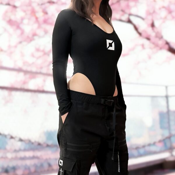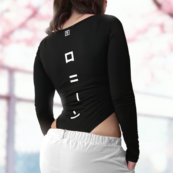 Body negro estilo cyberpunk de corte alto, con diseño de columna vertebral ronin en letras japonesas katakana.